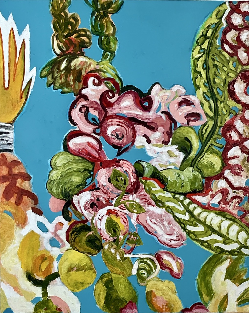 The tactile, layered surfaces of Caroline’s paintings are marked by technical and pictorial discrepancies, embodying the effort to sustain coherence amid instability – particularly but not exclusively related to the climate crisis. The traditional easel format utilizes the visual language of domestic space, reinforcing the normalization of crisis: an acknowledgment that disruption has become an ambient condition rather than an exception.